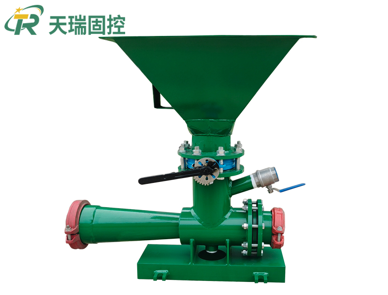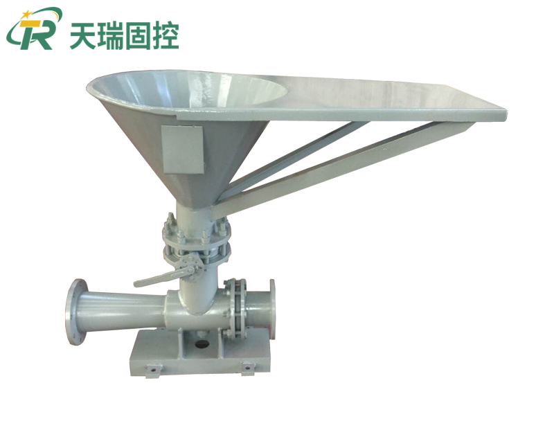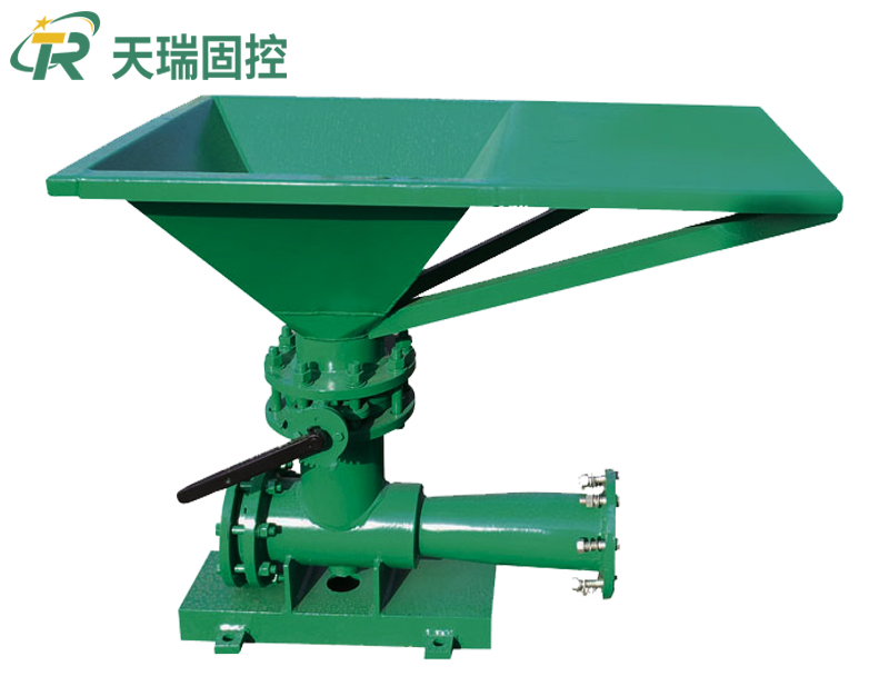 射流漏斗由进口变径接头、喷嘴、三通、喇叭出口、蝶阀、漏斗等组成。具有动能的高速流动的液体从进口变径接头进入喷嘴,液体以快速度喷射进入三通,同时添加材料从漏斗进入三通,添加材料与液体通过流动混合,由喇叭出口进入钻井液系统。