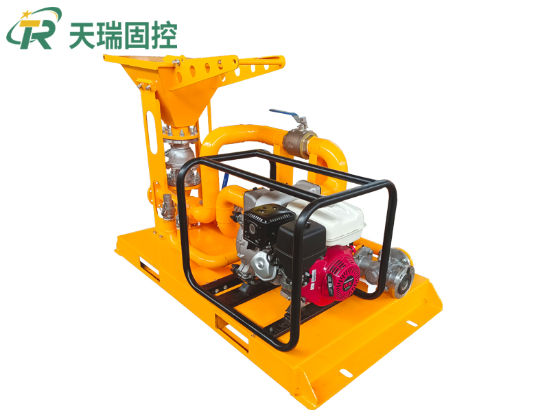 移动混浆装置主要由一台汽油泥浆泵,一台混浆漏斗和管汇阀门组成,这台汽油泥浆泵我们选用本田全进口泵,现场使用无需外接电源,具有流量大,扬程高,振动小,噪音低等优点。移动式混浆装置是用来配制或加重钻井泥浆的专用设备,它可以将膨润土,重晶石,聚合物等钻井液材料分散、均匀的加入到钻井液当中,从而改变泥浆密度、粘度、失水等重要性能参数。